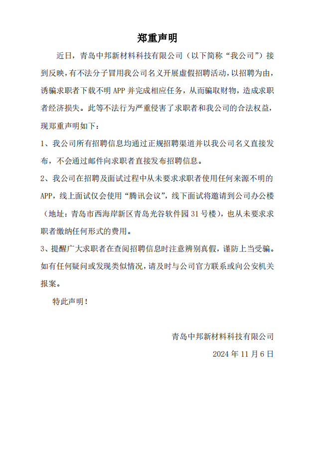 關(guān)于不法分子冒用我公司名義虛假招聘情況的鄭重聲明