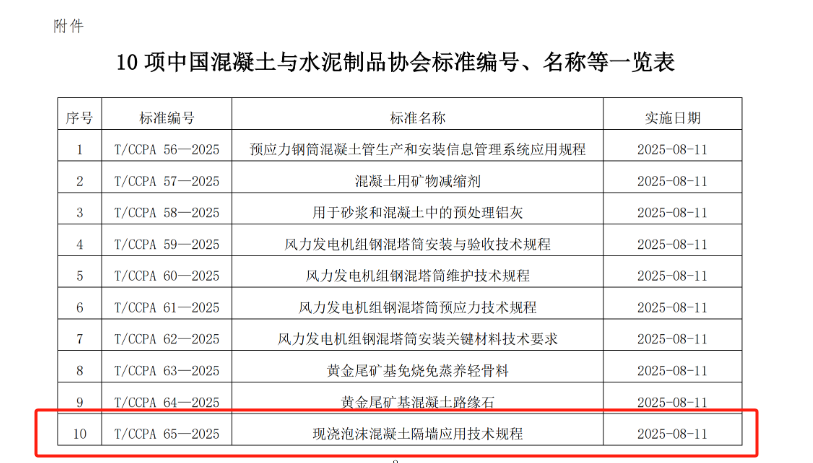 2025年4月11日,中國混凝土與水泥制品協會正式批準發布了《現澆泡沫混凝土隔墻應用技術規程》(T/CCPA 65—2025)等10項協會標準。該標準由我司主導編制,標志著我司在泡沫混凝土技術領域的領先地位和行業貢獻得到了權威認可。